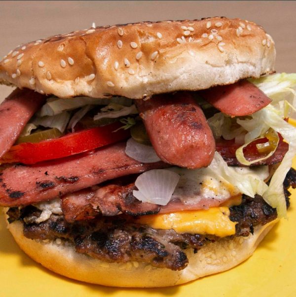 Carne, queso amarillo, jamón, queso oaxaca, tocino, salchicha y verdura
